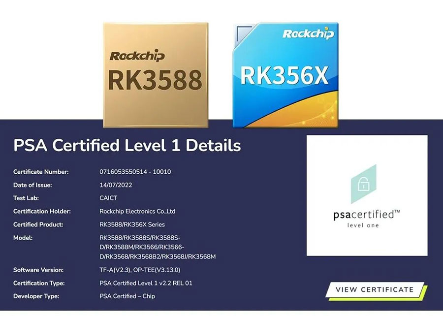 近日,瑞芯微RK3588及RK356X系列芯片(包含RK3588/RK3588S/RK3588S-D/RK3588M/RK3566/RK3566-D/RK3568/RK3568B2/RK3568J/RK3568M)正式通過PSA Certified Level 1安全認(rèn)證。
