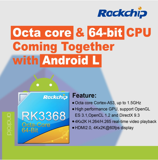 Firstly, RK3368 adopted 64bit Octacore and android L system appeared the first time.