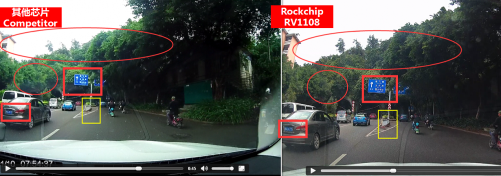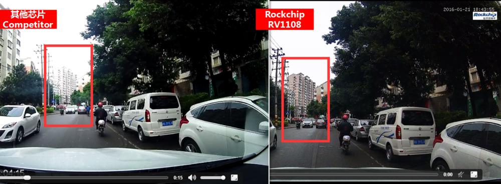 As an advanced graph and image processing technology, WDR(Wide Dynamic Range)technology directly influences the video shooting effect. The comparison of drive test results verifies the great image processing performance between Rockchip visual processing solution RV1108 and other solution. The car DVR, based on RV1108, shows the excellent image quality in day shot, night shot and backlighted shot as well as the superior sharpness, hence highlighting the outstanding advantages of WDR of RV1108 image processing.